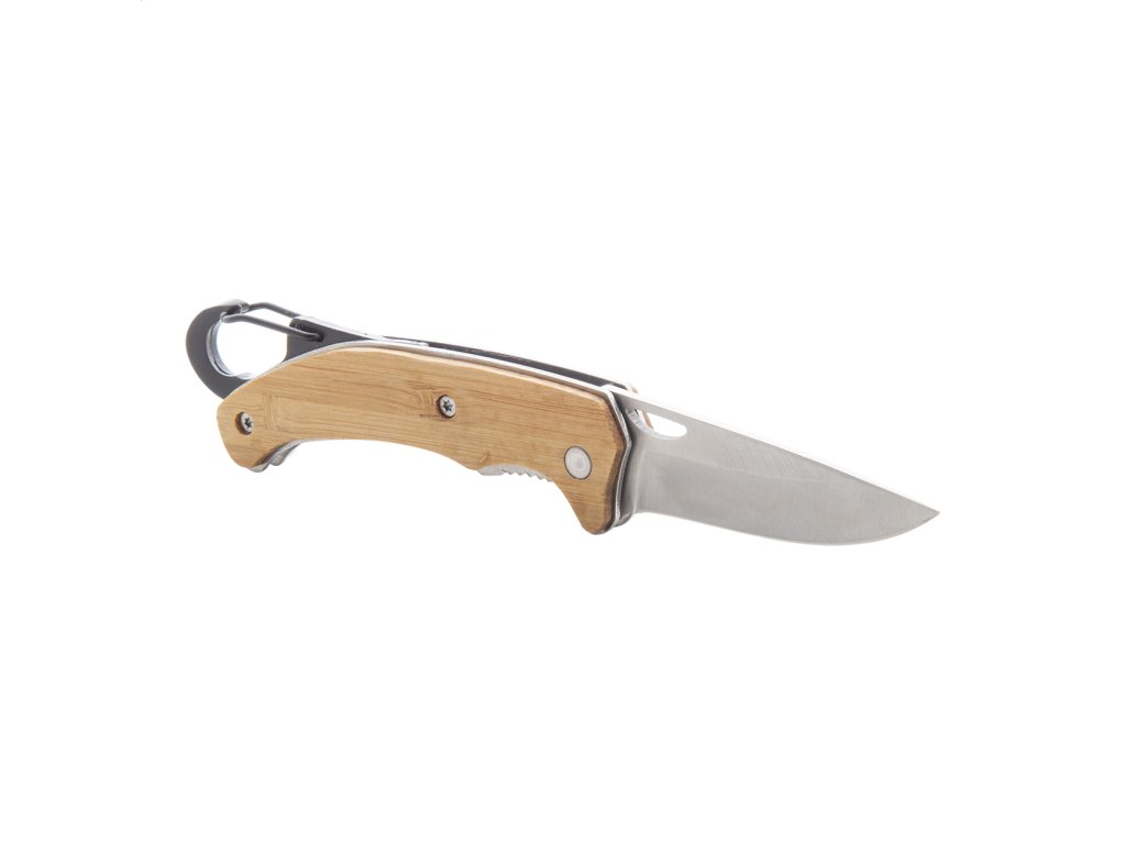 Vreckový nôž z nerezovej ocele s bambusovou rukoväťou a karabínou. S bezpečnostným zámkom.Dodatočné parametre