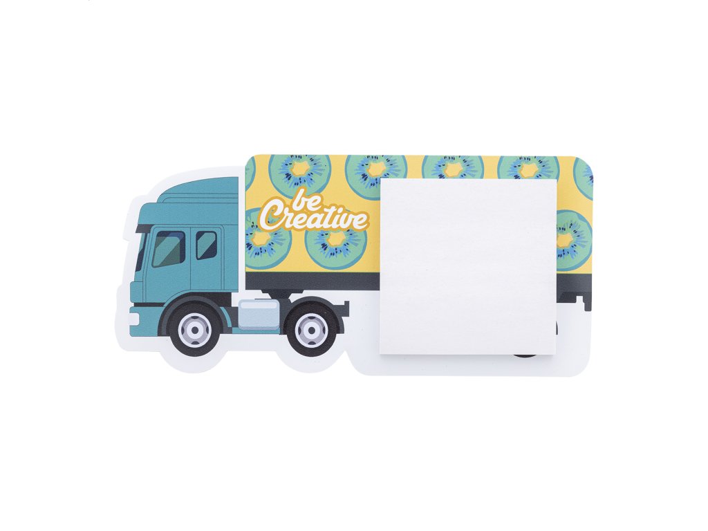 Magnet na chladničku v tvare nákladného auta s farebnou potlačou a samolepiacim blokom. Obsahuje 50 listov samolepiacich papierov z recyklovaného papiera (75×75 mm). Min. mn.: 100 ks.Dodatočné parametre