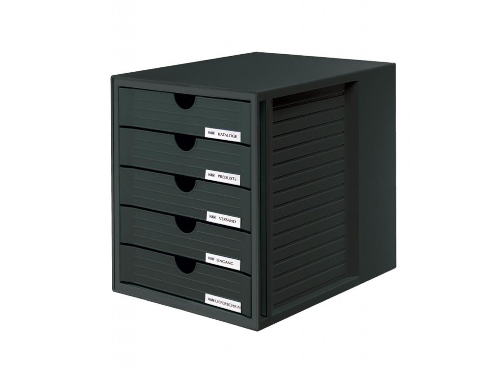 Plastový zásuvkový box s piatimi zatvorenými zásuvkami. Zmestí sa do ľubovoľnej police určenej pre zakladače, pretože výška boxu je totožná s výškou pákových zakladačov (275 × 330 × 320 mm).Farba boxu/zásuvky: čierna/čierna