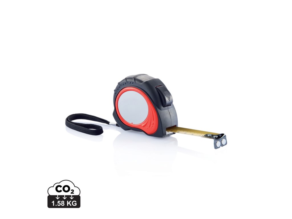 Zvinovací meter 5 m/19 mm, červené puzdro ABS s čiernym pogumovaným úchytom, sponou na opasok a 2 magnety. Matná strieborná PVC prelepka.Dodatočné parametre