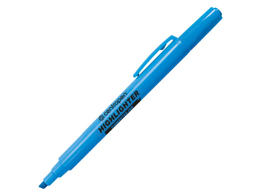 Celofluorescenčný zvýrazňovač s trojuholníkovou úchopovou časťou, s reflexným atramentom vhodným na písanie na všetky druhy papiera, vrátane faxového a samokopírovacieho. Klinový hrot, šírka stopy 1 - 4 mm, s ventilačným uzáverom. Farba modrá.Dodatočné parametre